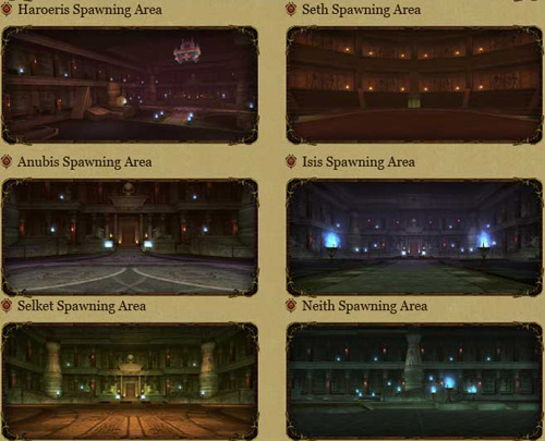 Tại khu vực 2 thánh địa trọng yếu này, các thành viên thuộc 2 liên minh đối lập bắt buộc phải làm toàn bộ những nhiệm vụ tuần hoàn ở NPC đại diện cho các liên minh như đã hướng dẫn ở phần trên cho đến khi boss (Anubis/Isis) xuất hiện. Vì có điều kiện là điểm AP nên khi tiêu diệt boss ở khu vực này sẽ có cơ hội sở hữu các vật phẩm giá trị với tỉ lệ cao hơn ở 2 thánh địa Chế Ước và Lam Tuyết.