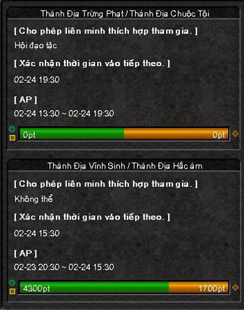 Để nhận biết số điểm AP khi 2 bên liên minh đối lập tham gia làm nhiệm vụ sẽ được hiện thị trong bảng AP. Màu vàng biểu thị cho liên minh Đạo tặc. Màu xanh biểu thị cho liên minh Thương nhân và Bảo tiêu.