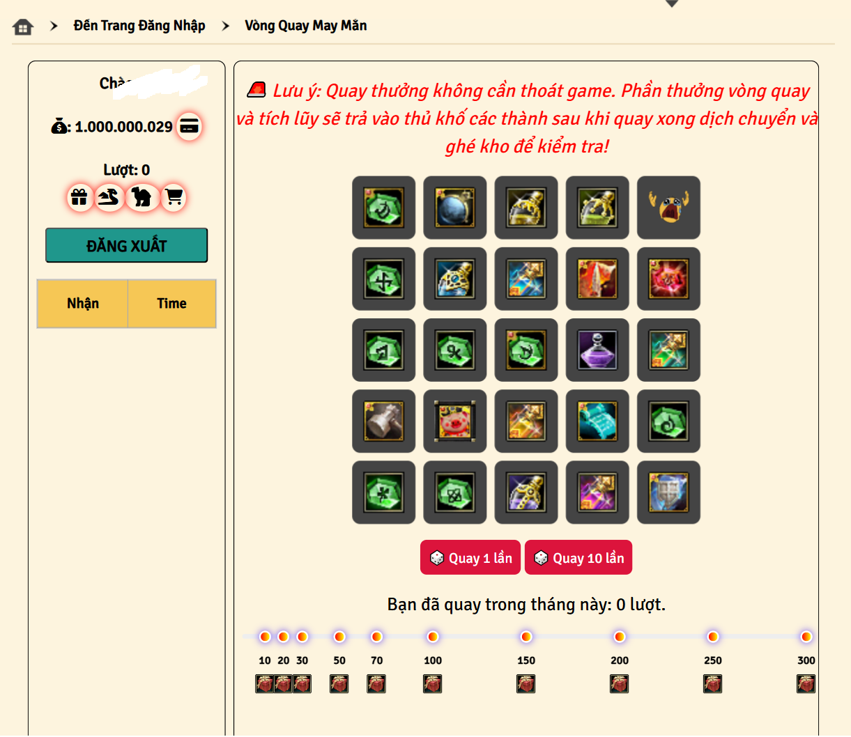 Để nâng cao tính giải trí của game cũng nhưng cung cấp thêm 1 số vật phẩm cần thiết để AE nâng cấp trang bị và nhân vật GM xin giới thiệu Vòng Quay May Mắn để ae trải nghiệm